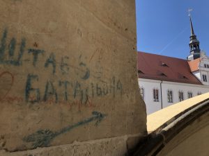 Интересный курьёзный момент: надпись с времён размещения Торгау советский войск после завоевания: «кухня батальона N2“, написанная на стене и, я бы сказала любовно сохранённая гражданами города. Таких надписей я встречала в Восточной Германии не раз . Позже в замке на потрясающе красивой лестнице эпохи Возрождения реставраторы сохранили этот отпечаток времени и там: стрелка, с надписью «штаб батальона N5“